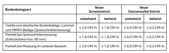 Zur Feuchtemessung wird allgemein die anerkannte und bewährte CM-Messung (Calciumcarbid-Methode) empfohlen. Bei der Messung sollten die in der Tabelle genannten max. Feuchtigkeitswerte nicht überschritten werden.