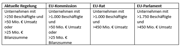 Am 13. November 2025 hat das Europäische Parlament seine Verhandlungsposition zu den geplanten Änderungen der EU-Richtlinien zur Nachhaltigkeitsberichterstattung (CSRD), zur Lieferkettensorgfaltspflicht (CSDDD) und zur Taxonomie beschlossen. Das Parlament spricht sich dabei für höhere Schwellenwerte bei Anwendung der CSRD aus. Damit sollen künftig nur noch Unternehmen mit mehr als 1750 Beschäftigten und einem Jahresumsatz von über 450 Mio. Euro berichtspflichtig sein. Dieselben Schwellenwerte sollen auch für die Anwendung der EU-Taxonomie gelten.