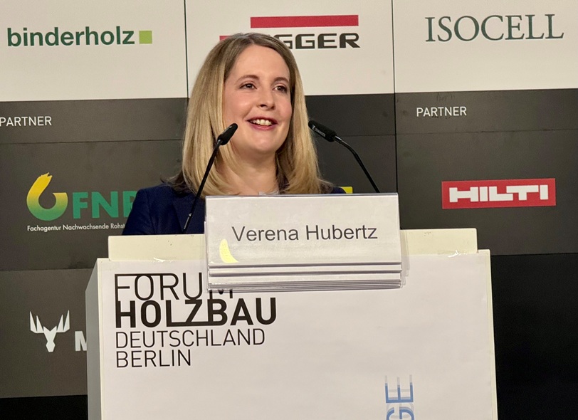 Bundesbauministerin Hubertz bezeichnete den Holzbau klar als strategischen Pfeiler und erklärte: Holz ist für mich ganz klar ein Pfeiler, wenn es darum geht die baupolitischen Herausforderungen unserer Zeit zu meistern. Wenn wir schneller, günstiger und klimafreundlicher bauen wollen, führt am Holzbau kein Weg vorbei. Die Branche ist innovativ, mutig und bereit für den großen Aufbruch. Das ist genau die Richtung, die wir brauchen für mehr bezahlbaren Wohnraum.