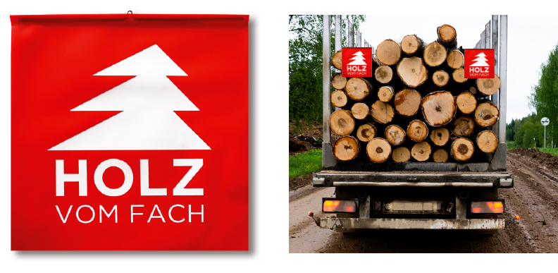 Unsere PVC Warnflaggen kennzeichnen nicht nur den Ladungsüberhang Ihres Fuhrparks, sondern werben zeitgleich mit gut sichtbarem Holz vom Fach