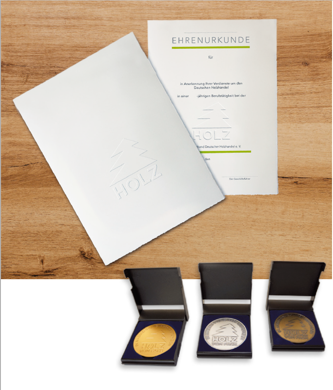 Die Ehrenurkunde im DIN A4-Format ist auf wertvollem Bütten-Papier (260 g/m²) gestaltet. Die Blindprägung des Holz vom Fach-Logos verleiht dem Anlass einen angemessenen Charakter. Die Urkunde wird