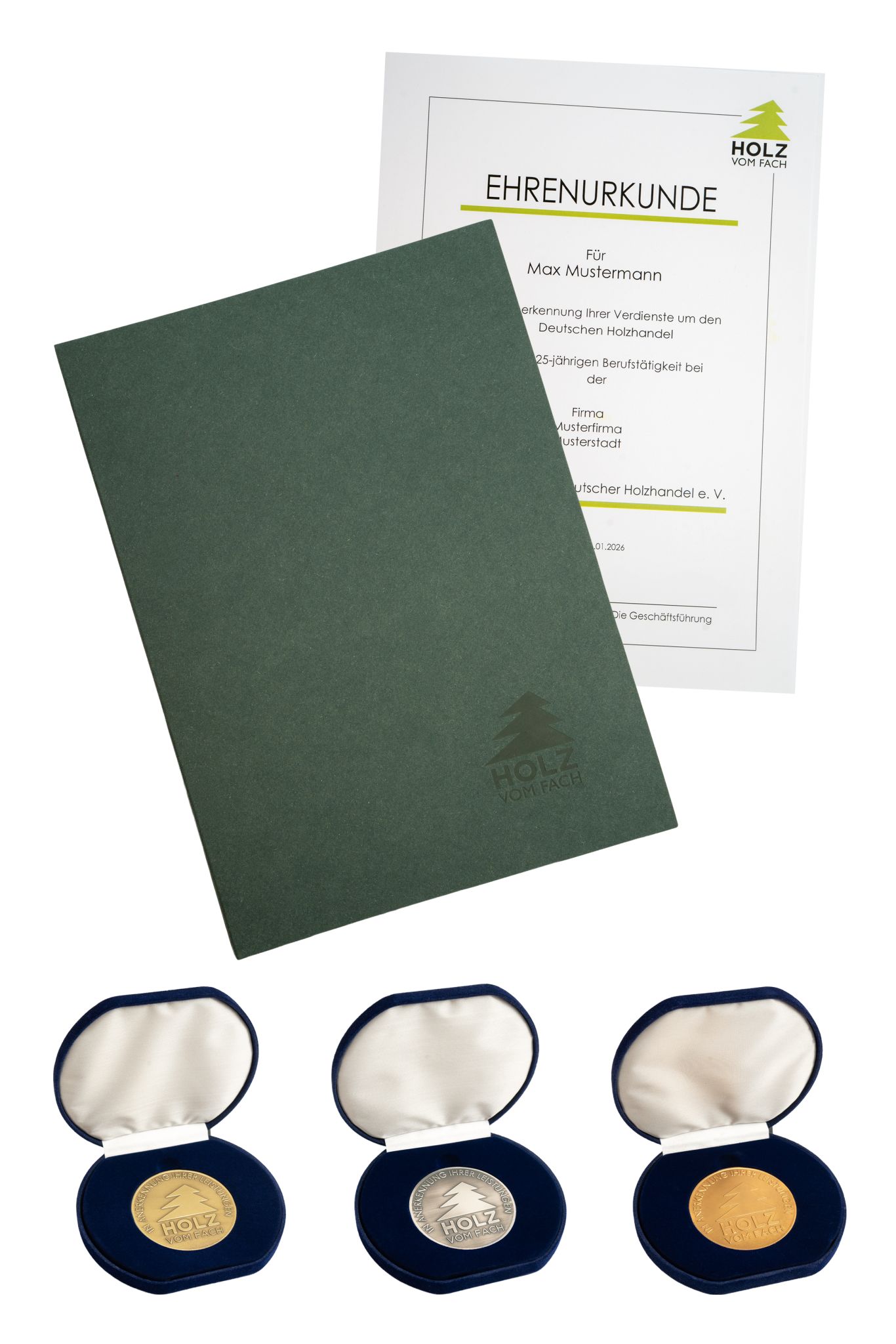 Ehrenurkunde inkl. einer Ehrenplakette in Bronze, Silber oder Gold im Etui für Firmenjubiläen von Mitarbeitern