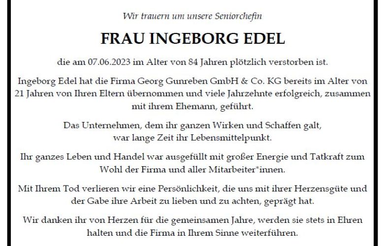 Nachruf der Firma Georg Gunreben GmbH & Co. KGFrau Ingeborg Edel ist am 07.06.2023 im Alter von 84 Jahren verstorben. Mehr erfahren ► |